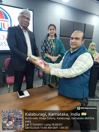 Khaja Bandanawaz University (KBNU) hosted its Ph.D. Orientation Programme for the 2025 cohort on October 8 at Lecture Hall No. 4, Department of Forensic Medicine and Toxicology. The event was presided over by Prof. Syed Ashfaq Ahmed, Dean (Research) and Pro-Vice Chancellor, KBNU, and graced by Dr. Sujata V. Mallapur, Dean (Research), Department of AI and Machine Learning, Sharanbasva University, as the Chief Guest.